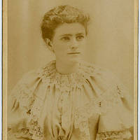 Portrait of an unidentified woman in a dress with ruffles. She appears similar in appearance to Minerva ("Minnie") Jane Knighten Walker, a local resident. This photograph was taken by a studio photographer who was active in Forest Grove in the 1880s-1890s. The photo was originally found with other Walker Family material.