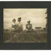 Three women seated on the grass next to a tennis net. Two are holding tennis rackets.