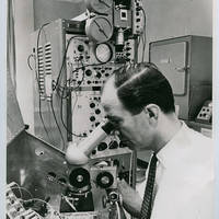 Professor Leonard Levine using research equipment in the Physiology Research Laboratory in the Pacific University College of Optometry.