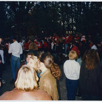 Numerous students gathered around a group of people (mostly female) in matching orange sweatshirts. Some have face painting. One girl may have 'Women's Soccer' written on her sweatshirt.