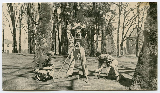 Three Pacific University students surveying on campus. Herrick Hall and Old College Hall can be seen in the background.