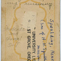 [back] Henry Spaulding [sic], son of H. H. Spaulding - missionary. Spaulding, Henry (son of H. H. Spaulding, missionary).