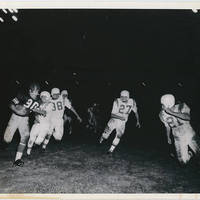A Pacific University football player runs with the ball during a game [possibly Gail Printz].