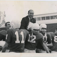 A group of Pacific University footballers carrying an unidentified man on their shoulders.