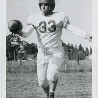 Rex Lockett, a Pacific University footballer, goes to kick the ball. He is a freshman in this photo and came to Pacific from Elgin, Oregon.