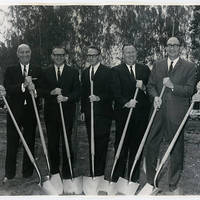 Seven men with shovels breaking ground for Jefferson Hall at Pacific University.