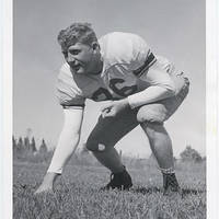 Bill Hughes, a junior and football player at Pacific University, poses in a defensive stance.