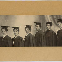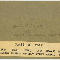 [back] Class of 1907, First to have caps & gowns; Class of 1907 - Sarah Baldrick; Ethel Moseley; Pearl Chandley; J. W. Peters; Howard Markel; Caroline Fitch