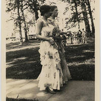 Two young women of the 1931 May Day court walk behind the May Day Queen.