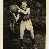 A member of Pacific University's 1920-21 basketball team poses with ball.