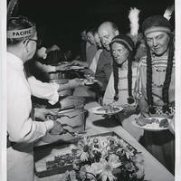 A photograph of attendees wearing redface while in line for a buffet at a Pacific University alumni dinner, held between 1957-1959. There were at least two alumni dinners held during this time period, which were advertised under the title, "Pow-Wow Dinner." The event did not actually include Native Americans. From photographs, it appears to have included: white performers dressed in wigs, makeup and costumes (similar to the two who appear in this image) performing a fake "pow-wow" dance; university officials wearing Native-style chieftain headdresses; attendees being given headbands with feathers to wear; and decorations mimicking a forest setting. This took place in Pacific University's Old Gymnasium.