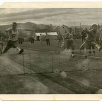 Photograph of Pacific University's track team jumping over hurdles. They appear to be competing against another school.