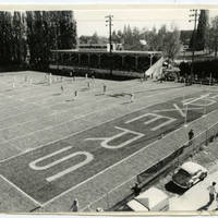 Photo shot from above the Pacific University field, where there is a football game in progress.