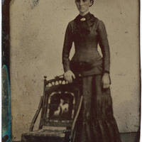 Portrait of a young woman standing next to a chair.