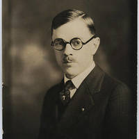 Portrait of an unidentified man with round glasses.