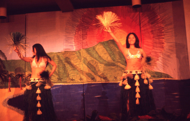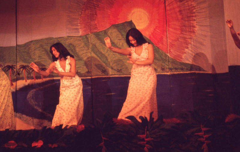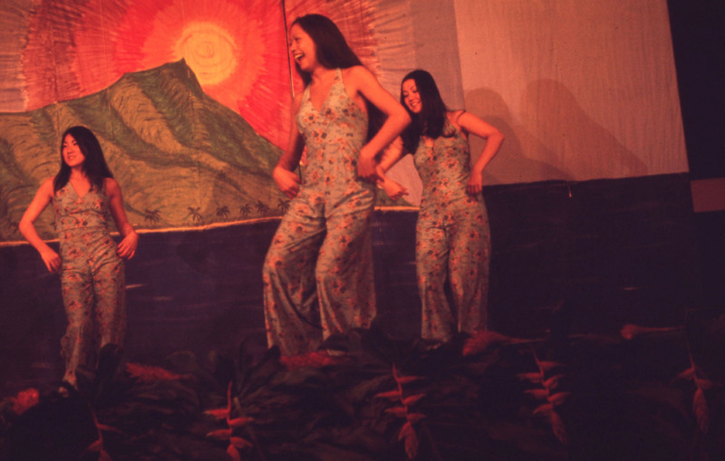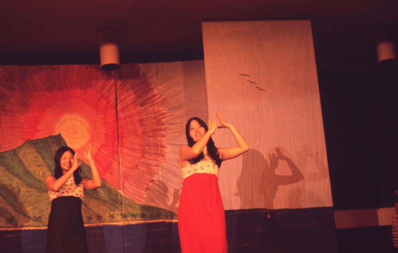 Pacific University students performing the hula on stage at the university's annual Lu'au in 1975. The photographer, Peg Osland, was on the staff of Pacific's publicity department.