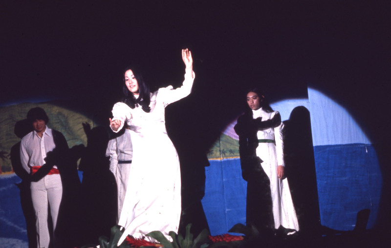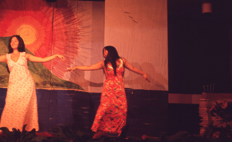 Pacific University students performing a dance on stage at the university's annual Lu'au in 1975. The photographer, Peg Osland, was on the staff of Pacific's publicity department.