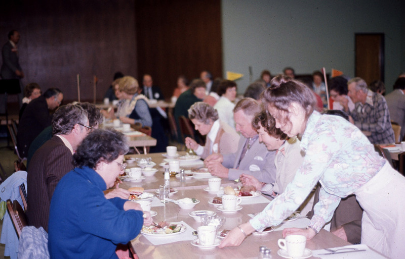 Several tables of people, most likely parents of Pacific University students, eating a luncheon in the MPR (Multi-Purpose Room) of Washburne Hall. This was likely taken during Parent's Weekend; possibly at a Parent-Faculty luncheon that took place on Apr. 16, 1977, several hours before Pacific University's annual Lu'au. One women in the background is wearing a lei. The original slide was printed in April 1977.