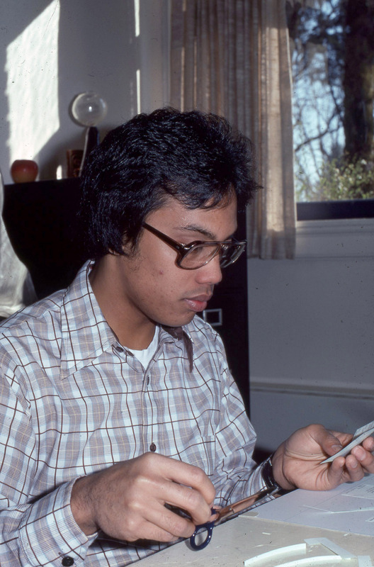 A Pacific University student focused on cutting out a piece of paper. He appears to be preparing a print layout, possibly for a journalism or media class. The original slide was printed in March 1978.