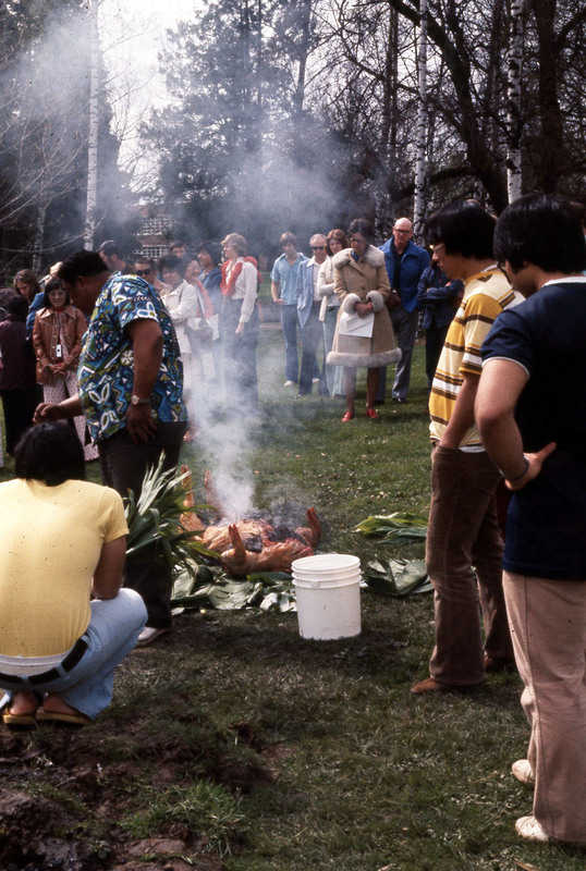 Students and family members from Hawaii roasting a pig for the 1976 Lu'au at Pacific University. Leaves for the roast are visible in the foreground. Other community members watch in the background.