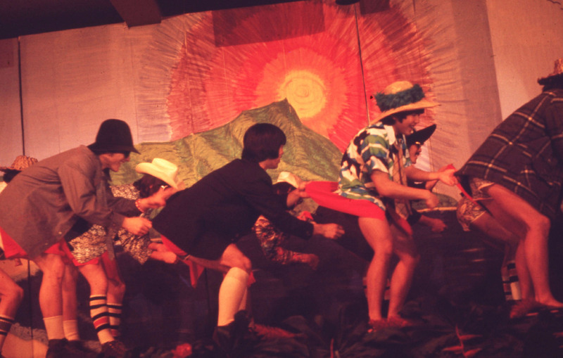 A group of male Pacific University students performing at the university's 1975 Lu'au. They appear to be dressed as tourists and are performing a humorous skit or dance, with each one bending over to grab the clothing of the man in front of him. The photographer, Peg Osland, was on the staff of Pacific's publicity department.