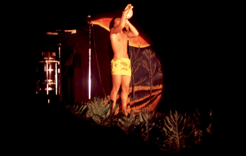 A student performer blowing on a conch shell, while standing in a spotlight on stage at Pacific University's annual Lu'au in 1976. The blowing of the conch usually signalled the entrance of the "King and Queen" of the Luau: two students who symbolically presided over the event while watching the dance performances.