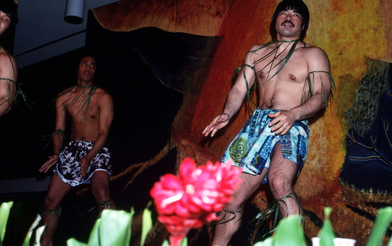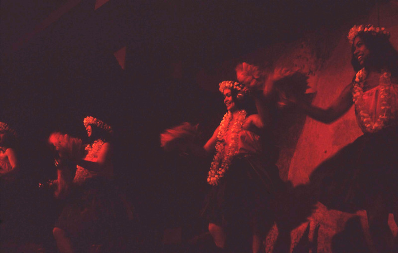 Dancers at Pacific University's annual Lu'au in 1976, pictured under red stage lighting. For a view of the same dancers under normal lighting, see: PUA_LuauSlides_119.