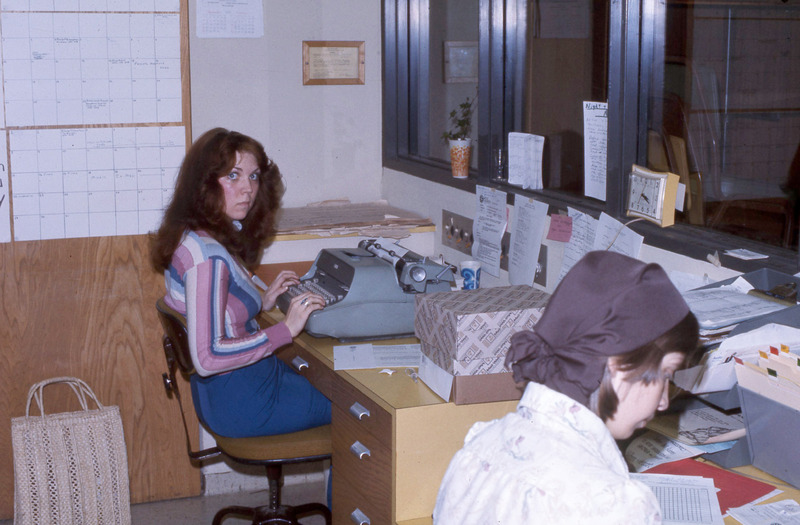 Two women, possibly administrative staff or student workers, staffing a desk at Pacific University. One is using a typewriter while the other appears to be reviewing files. The original slide was printed in October, 1976.