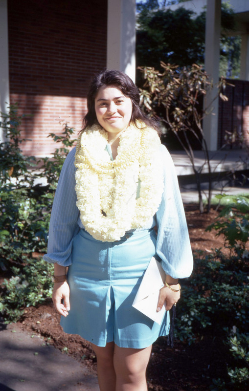 A student wearing a lei who appears to have just graduated, during Pacific University's Commencement in May, 1973. She is holding her robe, tam and diploma.