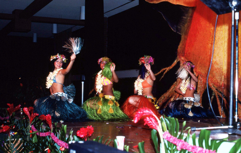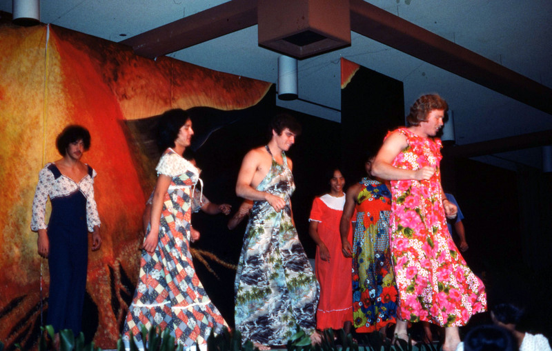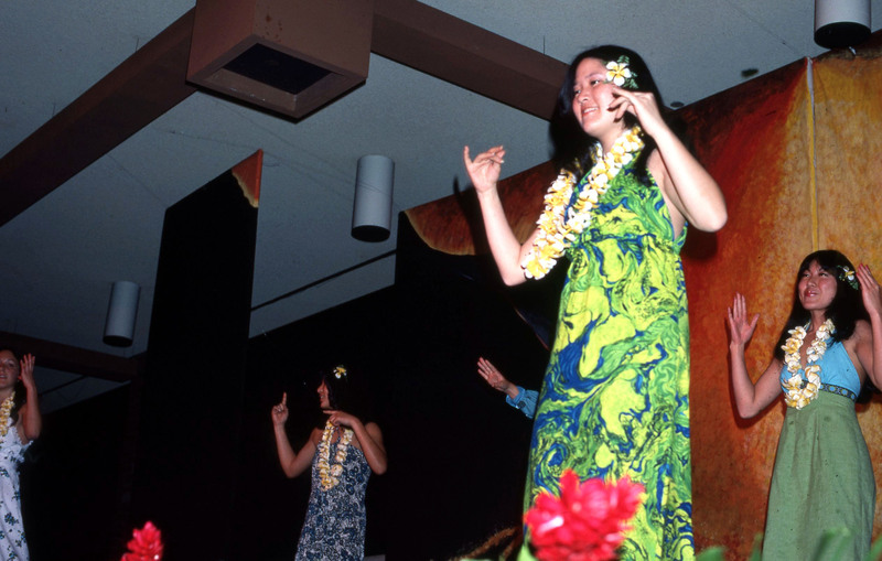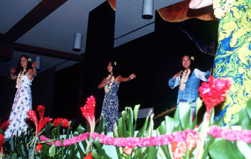 A set of women dancers wearing satin dresses and maile-style leis, performing at Pacific University's annual Lu'au in 1976. These may have been "Princesses" in the Lu'au's "Court". In many years, the Lu'au featured performances of women dancers each wearing a different colored dress, who would each represent one of the Hawaiian islands. They would perform solo dances for a "King" and "Queen," who would watch from the stage.