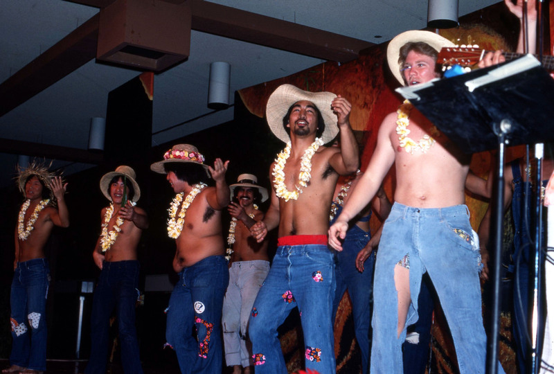 A group of male student performers wearing jeans and overalls at Pacific University's annual Lu'au in 1976. The Lu'au's musicians are visible on the left. The stage backdrop depicts a volcanic eruption.