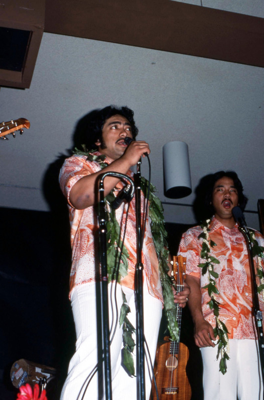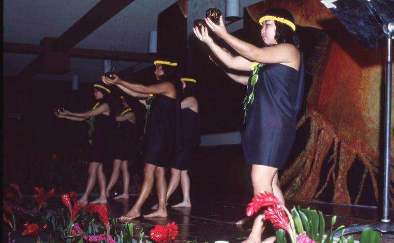 Student dancers performing at Pacific University's annual Lu'au in 1976. The male performers in the foreground appear to be holding ipu gourds, while the women in the background hold pu'ili sticks.