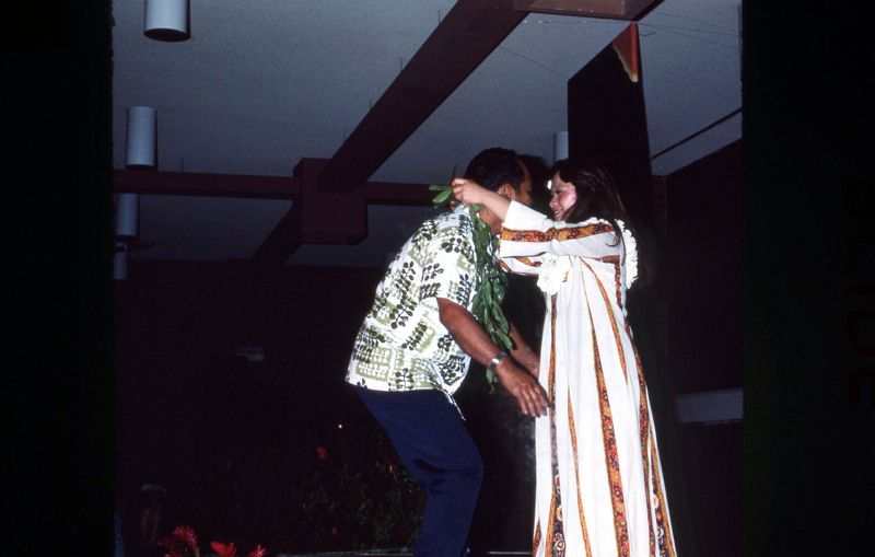 A woman student bestows a maile style lei on a guest at Pacific University's annual Lu'au in 1976. She is wearing a white dress with several strips of brown cloth sewn in as stripes, and a white lei; she may be playing the role of "Queen" or announcer. Based on other photographs from the same event, the man appears to have been an honored guest.