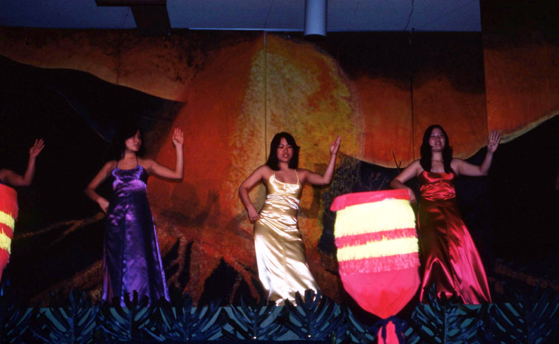 A set of women dancers wearing satin dresses, performing at Pacific University's annual Lu'au in 1976. These may have been "Princesses" in the Lu'au's "Court". In many years, the Lu'au featured performances of women dancers each wearing a different colored dress, who would each represent one of the Hawaiian islands. They would perform solo dances for a "King" and "Queen," who would watch from nearby. Red and yellow staffs meant to represent "kāhili," the traditional feathered symbols of Hawaiian royalty, are visible in the foreground.