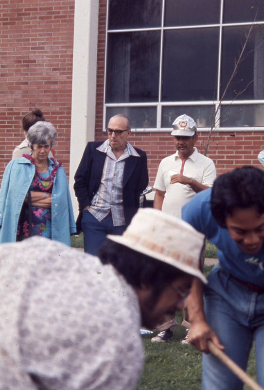 Attendees of Pacific University's annual Lu'au in 1976, observing the outdoor kalua pig roast. Students tending the roasting pit are visible in the foreground. The older couple in the background might be former University President Miller Ritchie and his wife, Josephine; he had left Pacific in 1970, but returned to Oregon in 1975 and remained active in college affairs during his retirement.