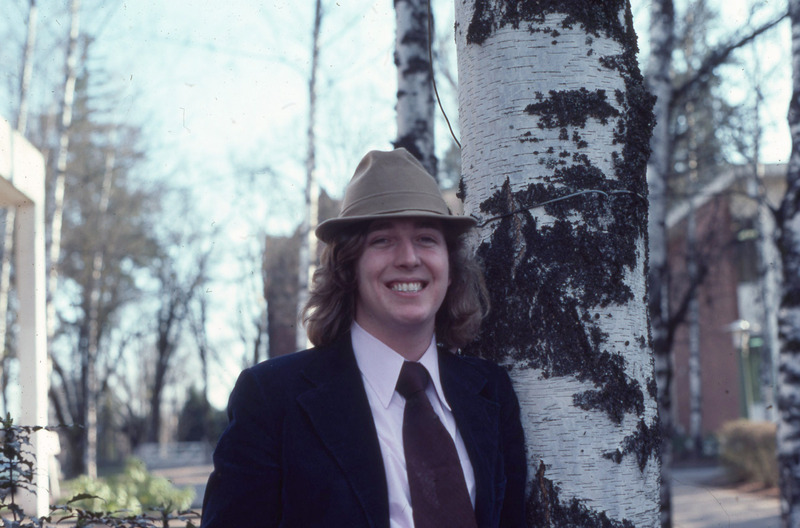 A student wearing a suit and a fedora, standing outside near Trombley Square on the Pacific University campus. The original slide was printed in March, 1975.