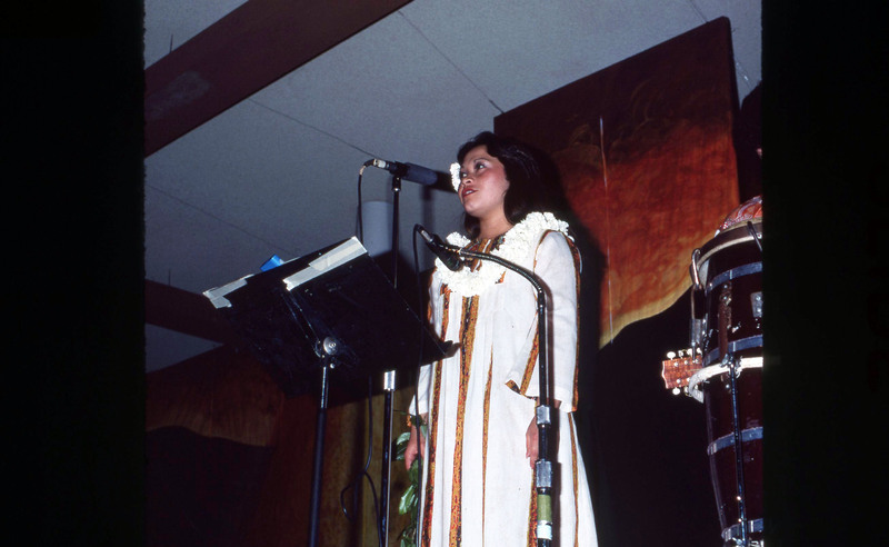 A woman student standing at the speaker's podium at Pacific University's annual Lu'au in 1976. She is wearing a white dress with several strips of brown cloth sewn in as stripes, and a white lei. She may be playing the role of "Queen" or announcer.