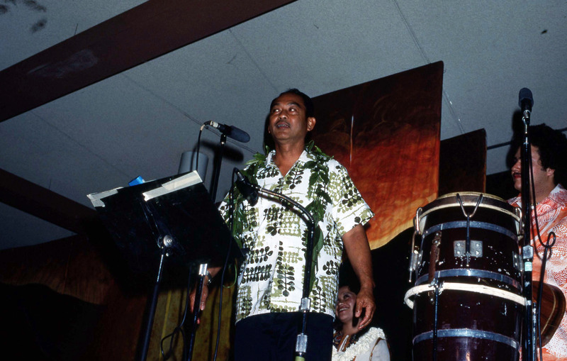 An older man standing at the speaker's podium at Pacific University's annual Lu'au in 1976. Based on other images from the same event, he had just been given the lei that he is wearing. He may have a parent or other relative who helped the students put on the Lu'au; or he might have been a special invited performer.