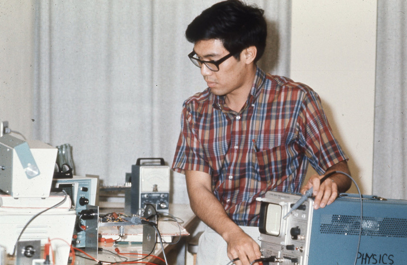 A Pacific University student operating electronic equipment, which has a stencil marked "Physics." He appears to be measuring electrical resistance or doing a similar task. This photograph was probably taken by a staff photographer to illustrate student experiences, possibly for use in a promotional publication. The slide was printed in March 1976, but is probably a reprint of an earlier photograph, most likely taken circa 1970-1974.