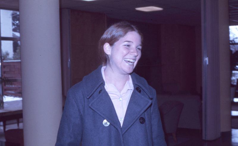 A smiling Pacific University student wearing a wool peacoat, standing inside the lounge of Walter Hall, which was a women's dormitory. The original slide was printed in December, 1971.