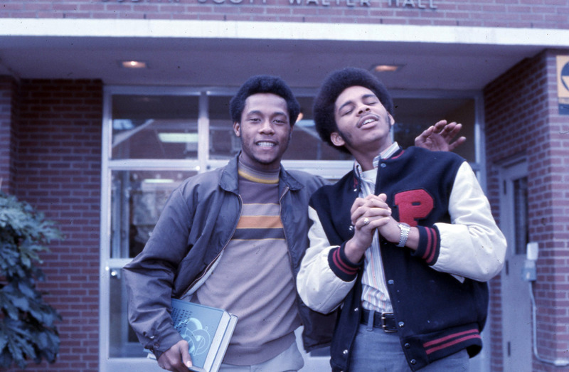 Two African American Pacific University students standing on the steps of Walter Hall, which was a dormitory. One is wearing a Pacific letterman jacket; the other is holding a Human Physiology textbook. The original slide was printed in December, 1971.