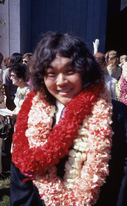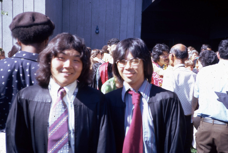 Two students dressed in graduation robes during Commencement in May, 1973 at Pacific University. The student wearing glasses may be Glenn Ginoza. Other graduating students appear in the background.
