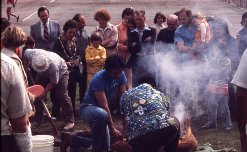 Students and family members from Hawaii roasting a pig for the 1976 Lu'au at Pacific University, while a crowd of observers looks on. The university's tennis courts are visible in the background.