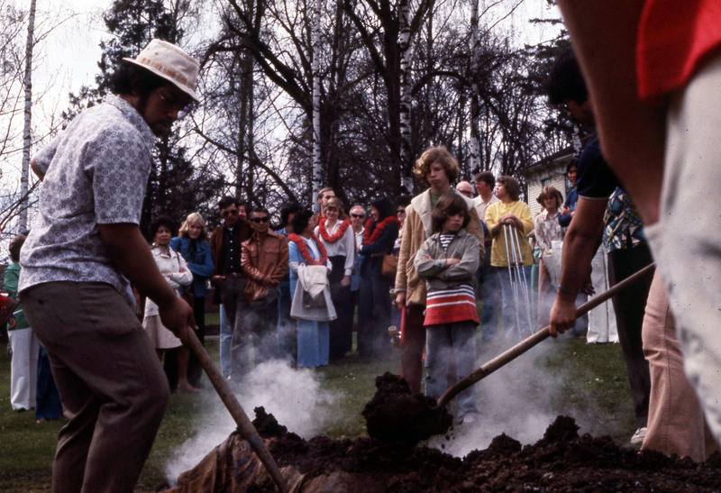 Students and family members from Hawaii shoveling dirt onto a roasting pit. They are preparing kalua pig for the 1976 Lu'au at Pacific University. Attendees, some wearing leis, watch in the background.