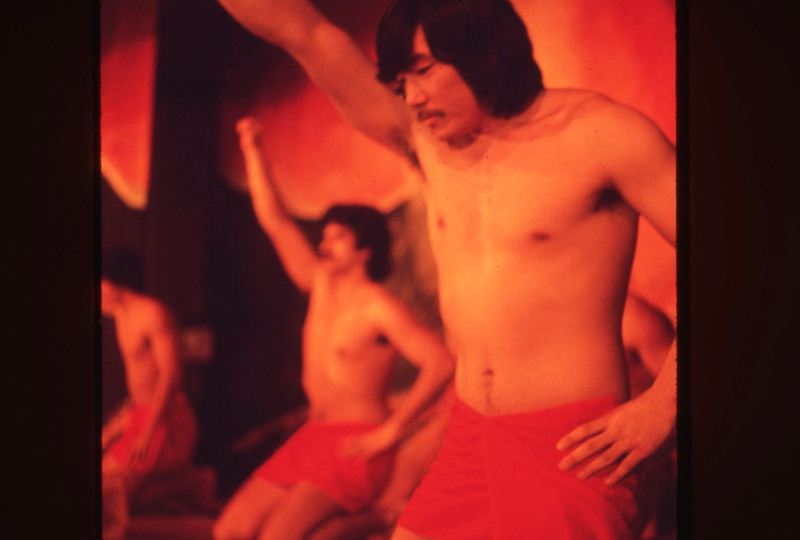 Several male Pacific University students, each wearing a malo or lavalava, performing a dance at the university's annual Lu'au in 1976. The backdrop depicts a volcanic eruption.