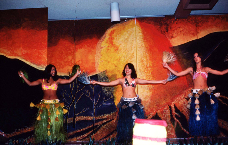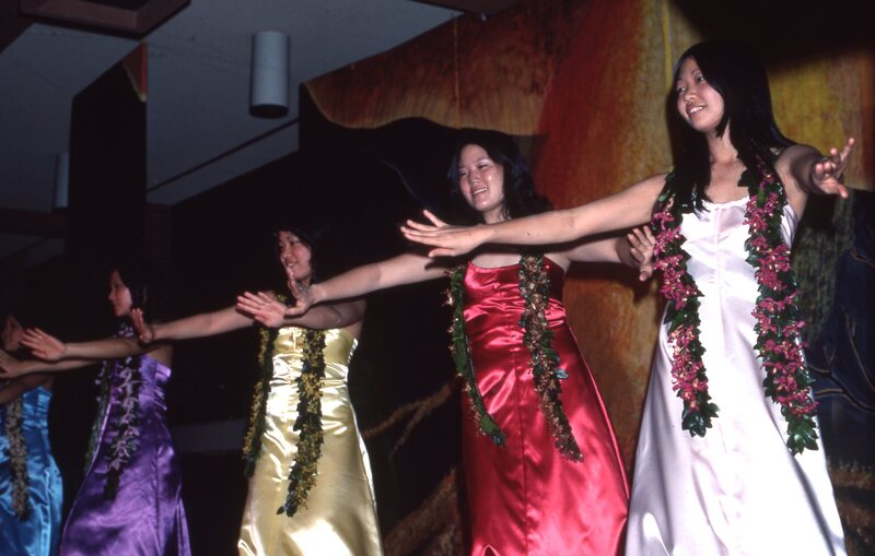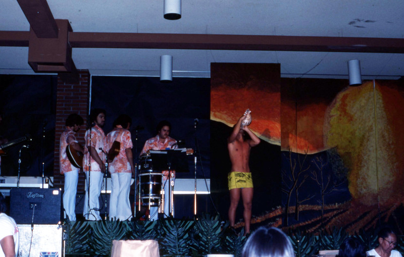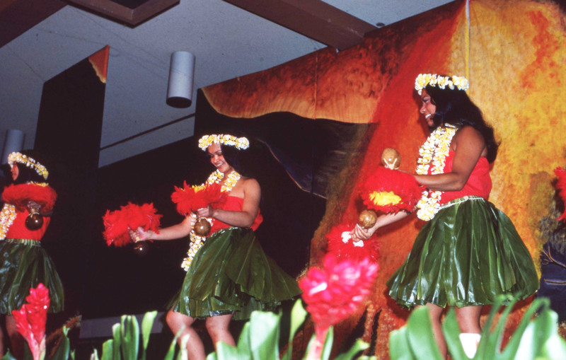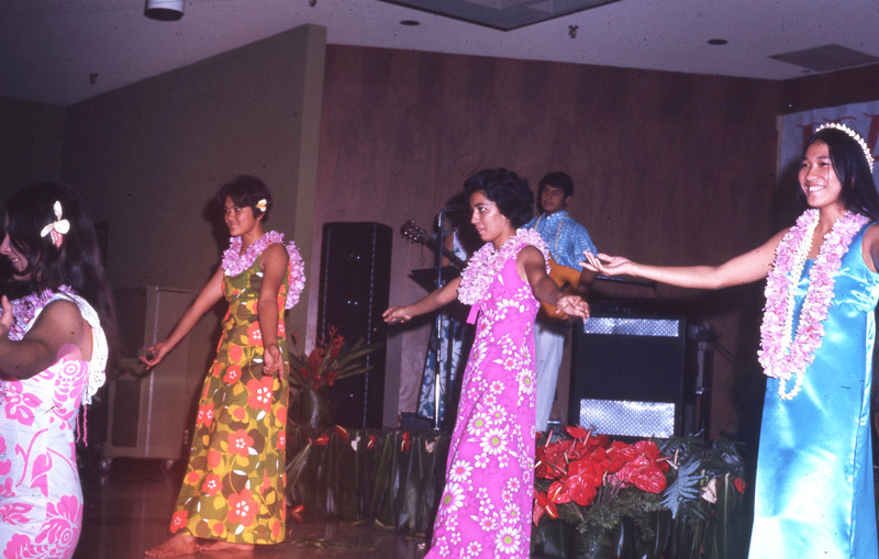 Five women dancers wearing satin dresses and maile-style leis, performing at Pacific University's annual Lu'au in 1976. These may have been "Princesses" in the Lu'au's "Court". In many years, the Lu'au featured performances of women dancers each wearing a different colored dress, who would each represent one of the Hawaiian islands. They would perform solo dances for a "King" and "Queen," who would watch from the stage. The backdrop on the set depicts a volcanic eruption.
