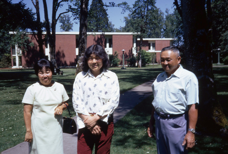 A student and his family members visiting campus during Commencement weekend in May 1973. Scott Library (later renamed AuCoin Hall) appears in the background. See the same student during the same weekend in image: PUA_PeoSlides_196.