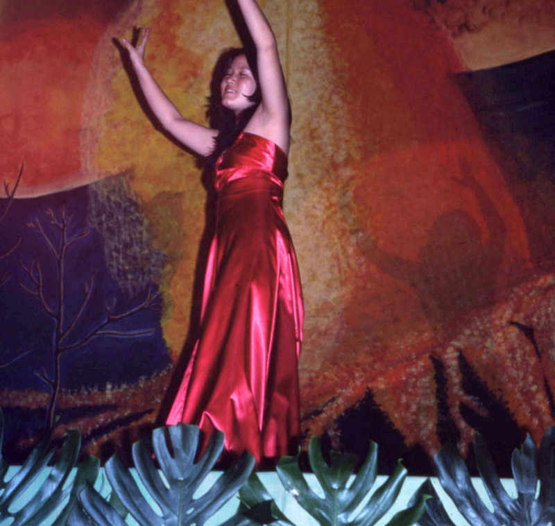 Dancer in a red satin dress at the annual Lu'au at Pacific University in 1976. She may have been portraying a "princess". In many years, the Lu'au featured performances of women dancers each wearing a different colored dress, who would each represent one of the Hawaiian islands. They would perform solo dances for a "King" and "Queen," who would watch from the stage. The backdrop on the set depicts a volcanic eruption.