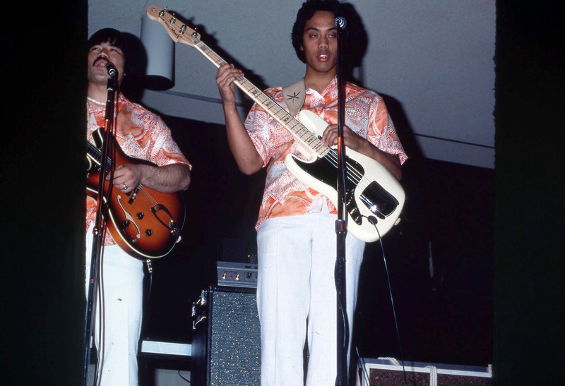 Two male musicians, one playing a ukulele while the other plays a drum, at Pacific University's annual Lu'au in 1976. They are wearing matching aloha shirts and white pants. The backdrop depicts a volcanic eruption.