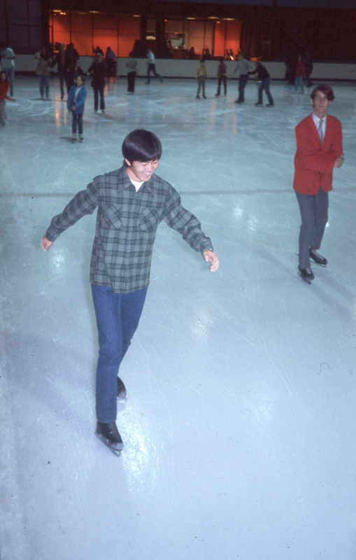 A Pacific University student, identified on the original slide as "Brian Mastomota," at an ice skating rink. A note on the original slide spells his last name as "Matomoto" then crosses it out and respells it "Mastomota;" it is possible that his name was the more common spelling, "Matsumoto." This appears to have been taken during an outing of Haumana O Hawai'i (Hawaiian Students Club) in December 1971. It was most likely taken at the Beaverton Ice Center.